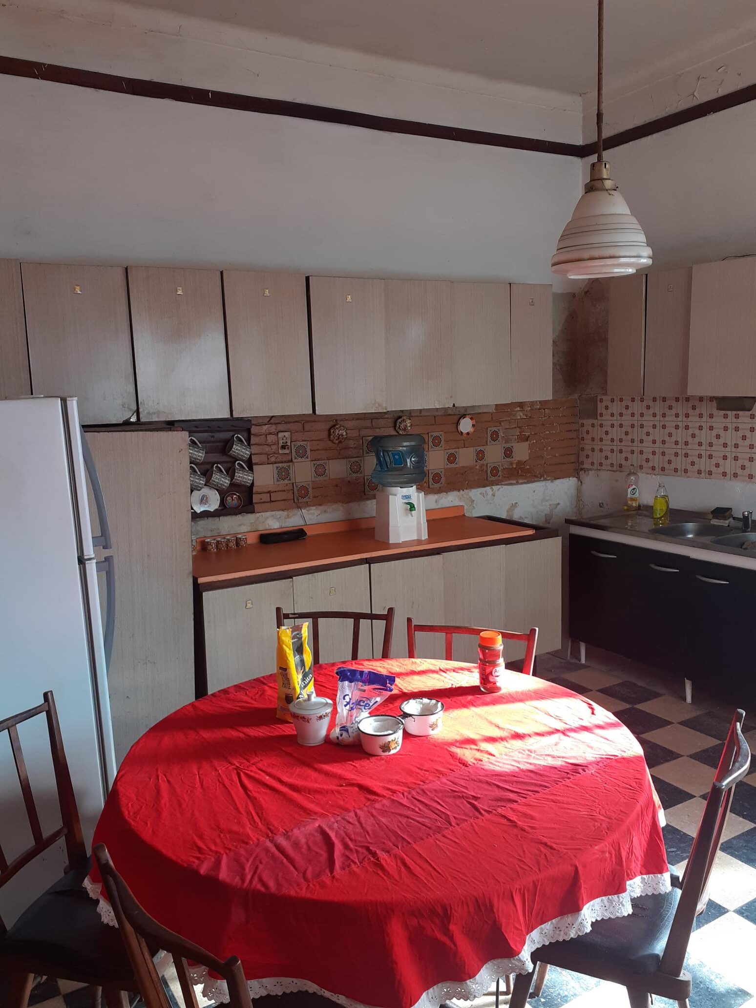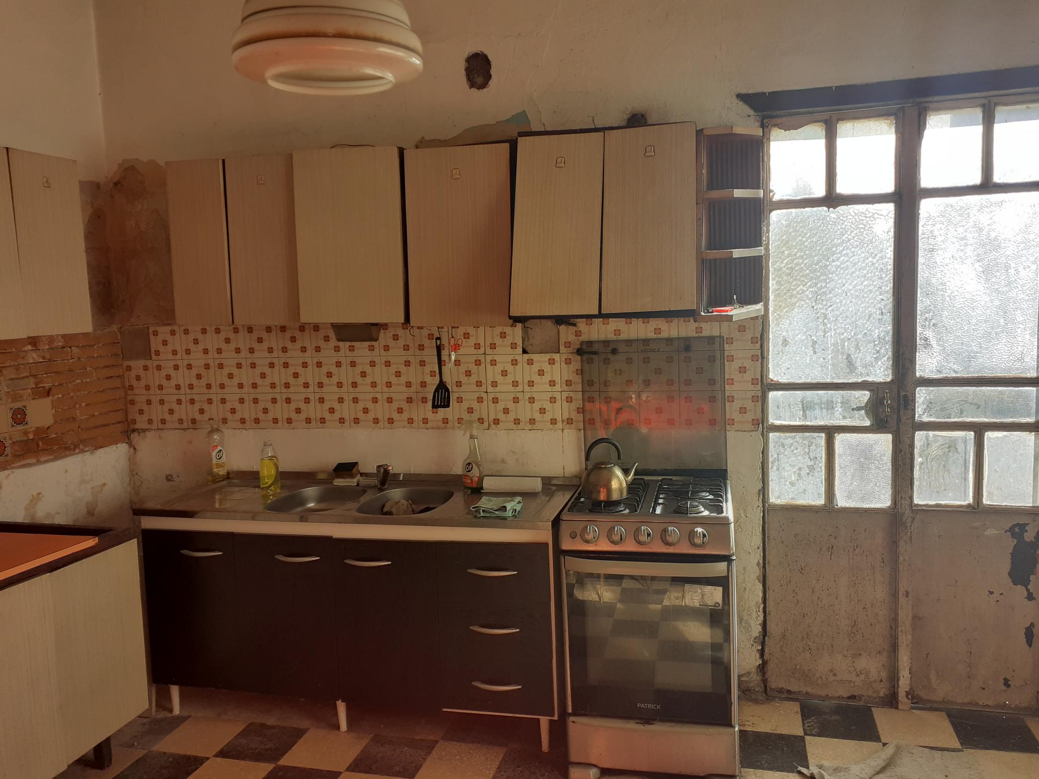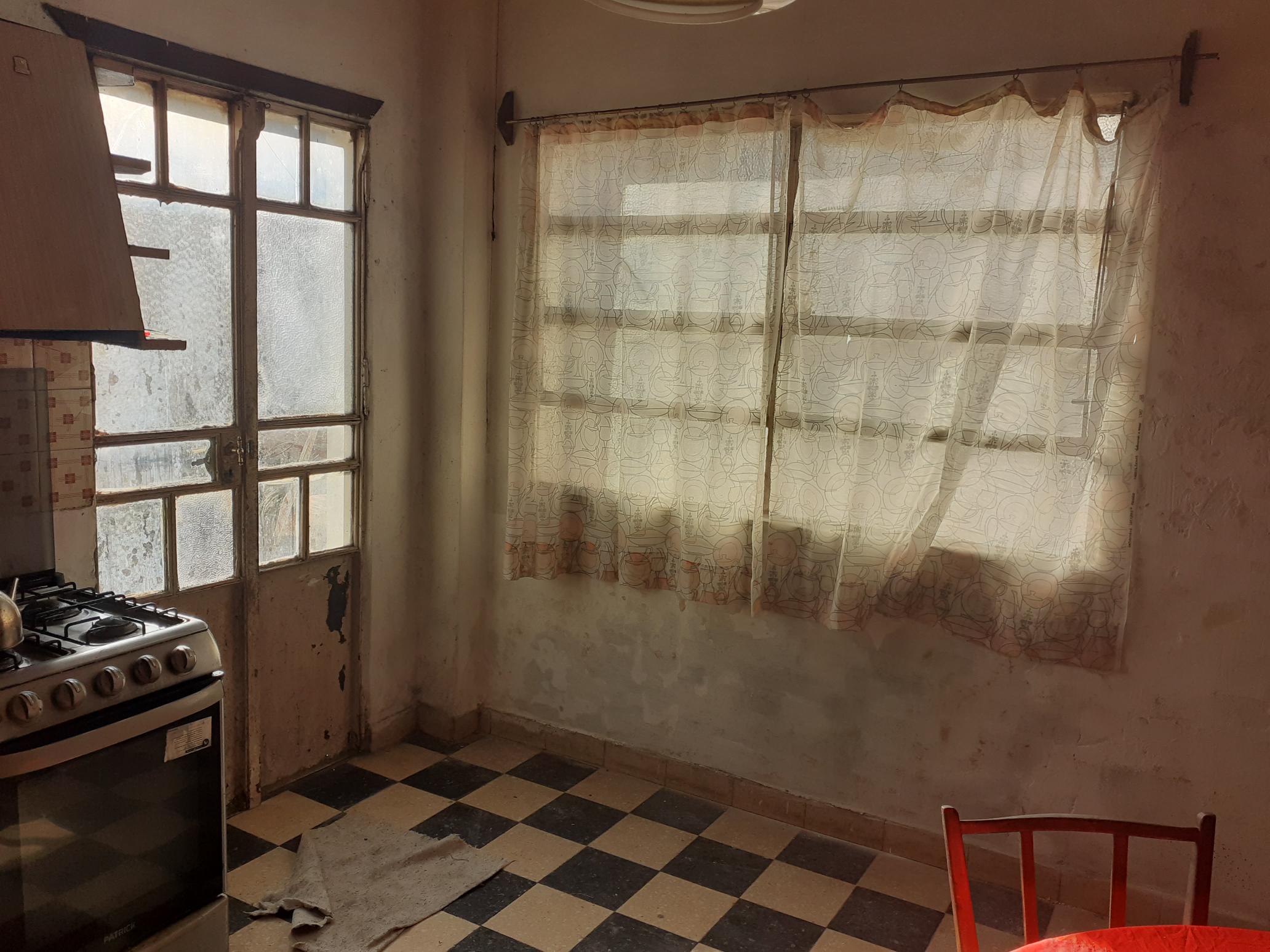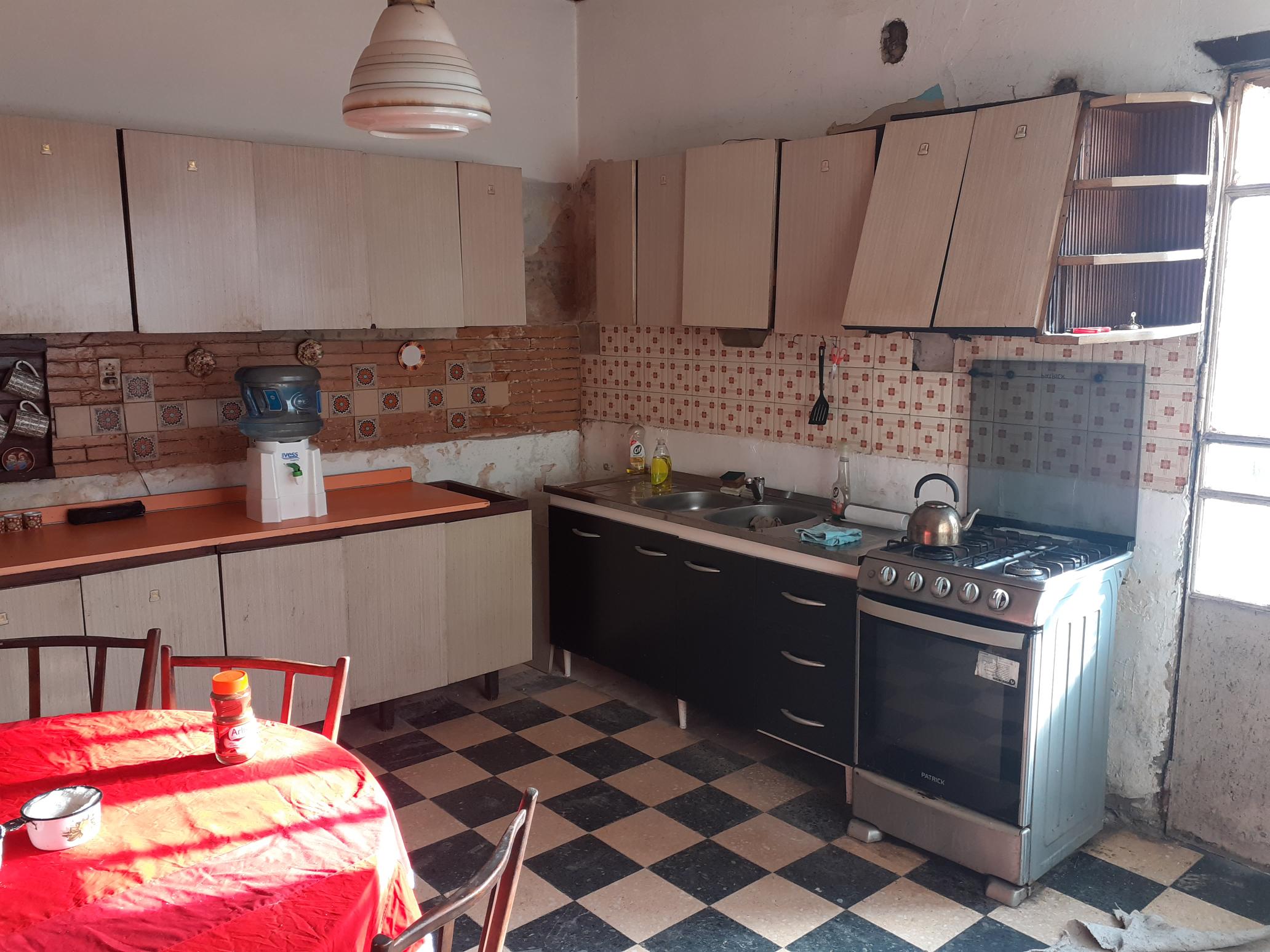 Cocina Comedor con muebles bajo y sobremesada, pisos mosaico